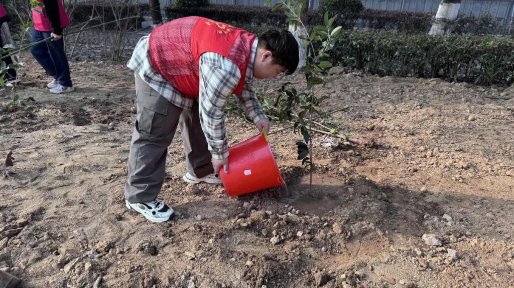 挥锹铲土、扶苗填坑、提桶浇水……志愿者们分工协作,配合默契,新植的树苗迎风挺立,在春日的阳光下焕发出勃勃生机,为校门口增添了一道靓丽的风景线。