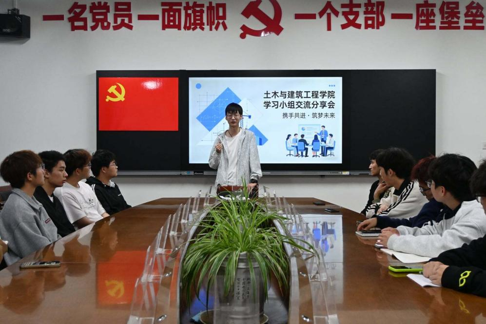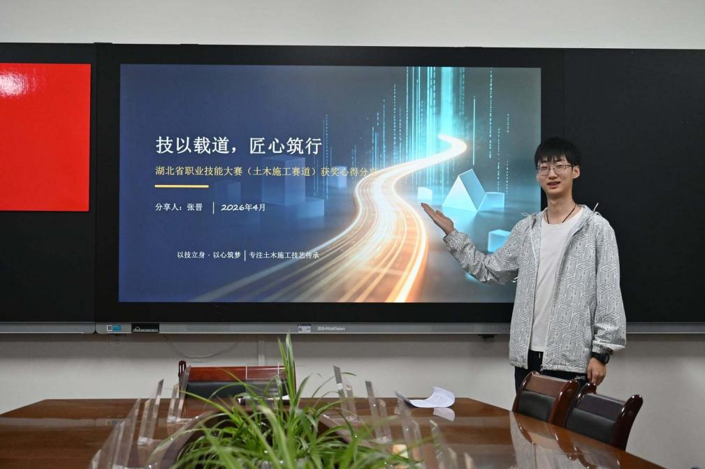 (通讯员:李欣)为发挥技能大赛获奖学生的示范引领作用,4月9日晚,土木与建筑工程学院在思成楼1107举办学习小组经验交流会。2026年湖北省职业技能大赛土木施工赛道获奖选手、24建筑2班张晋同学应邀分享备赛心得与成长感悟,30余名学习小组成员参加。