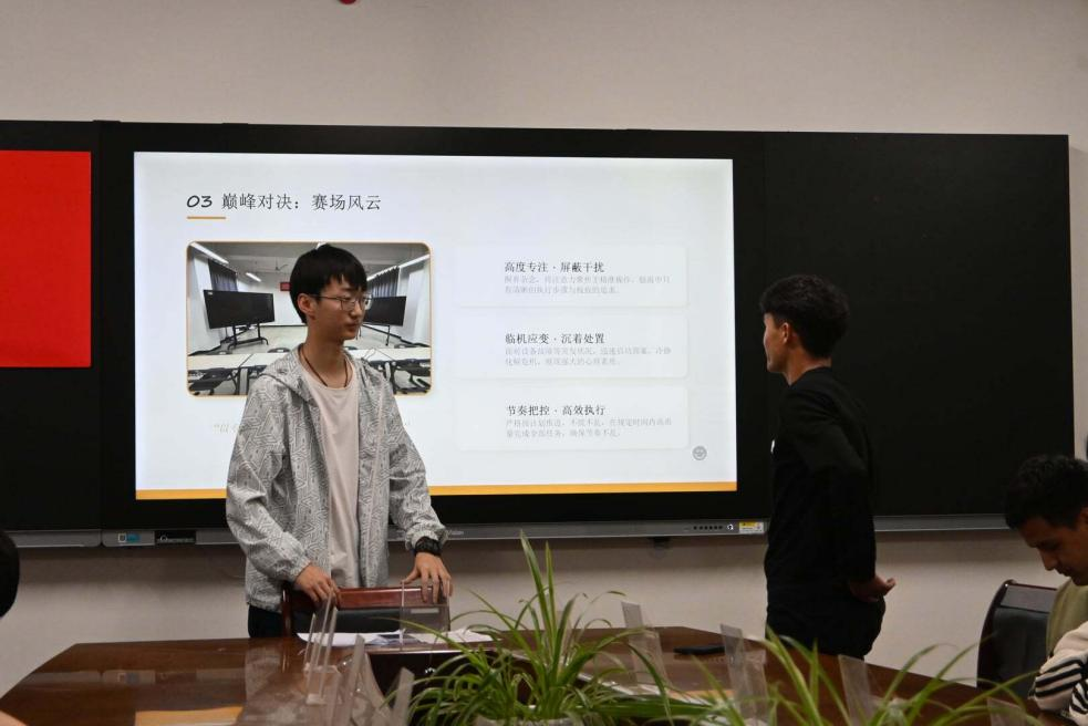 分享会上,张晋同学结合备赛与参赛经历,从技能训练、团队攻坚、赛场心态等方面进行细致分享。为熟练掌握参赛内容,他坚持反复练习、精益求精,即便嗓子沙哑仍不懈怠;面对模板搭设、节点稳定性等技术难点,他与团队组建攻坚小组,查阅专业资料、请教专家导师,通过大量方案推演与实操验证攻克难关。他强调,指导老师的精准指导为团队指明了方向,但成功的关键在于自身脚踏实地、反复锤炼,将专业技能内化为肌肉记忆,方能在高压赛场从容应对。